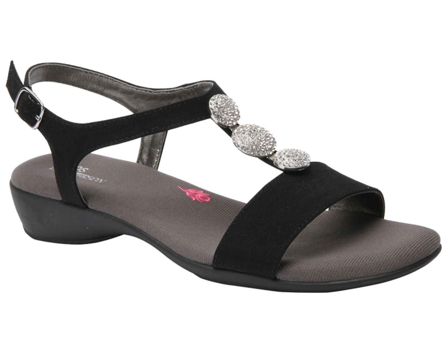 Premium quality materials and leather lining add a touch of class to the Mariel Sandal. Available in black or silver iridescent glitter, the Mariel adds elegance to any outfit. Rhinestone details add visual sass and a touch of sparkle to your look. The adjustable heel strap allows for a personalized loose or snug fit.
